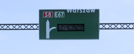 | Opis | Krzywy, niepelny napis na (prawie wszystkich) znakach na drodze S8 w strone Warszawy. | ||||