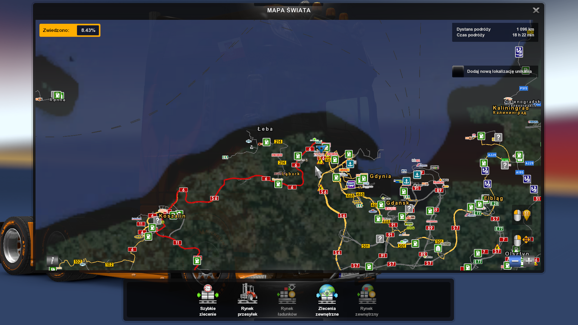 | Opis | W Północnej części Gdyni kierując się na Koszalin na objeździe znajduje się niewidzialna ściana w obu kierunkach. Niestety nie zdążyłem wykonać krok ze zmianami w pliku config w moich dokumentach, stąd też nie wyślę lokalizacji w pliku tekstowym ze współrzędnymi, natomiast zrobiłem screeny , moim zdaniem będzie wiadomo w którym miejscu to się znajduje , ponieważ jest tam tylko jedna praktycznie droga z objazdem. Dodatkowo zrobiłem zdjęcie widoku mapy. Stosuję inne modyfikacje mapowe a mianowicie : oczywiście PM +PR + rusmap + Promods ME + roextended + projectTurkey. Oprócz tego stosuję inne modyfikacje na traffic od jazyycat (AI traffic), również od jazzycat na dodatkowe ładunki, poza tym dodatek akcesroria kabinowe od sisl, modyfikacje graficzną Realistic graphic mods, sounfix, scs trailer pack , route advisior i backgraund od roex na widok satelitarny mapy. Dodam jeszcze tylko ,że zanim zacząłem stosować te modyfikacje, problem ten już wcześniej zauważyłem, tylko nie zdążyłem wtedy zrobić screena , omijając inną drogą tę niewidzialną ścianę. Jeśli dobrze pamiętam podobna sytuacja miała miejsce w innej części mapy z tą różnicą, że ściana znajduje się w jednym kierunku i pamiętam , że ominąłem ją zwyczajnie lewym pasem. Ale teraz już nie pamiętam dokładnie w którym miejscu, jak natrafię jeszcze raz na to, to dopiszę. | ||||